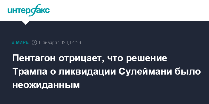 Москва. 6 января. INTERFAX.RU - Министерство обороны США отрицает достоверность статьи New York Times, в которой сообщалось, что Пентагон был шокирован решением президента США Дональда Трампа о ликвидации иранского генерала Касема Сулеймани.