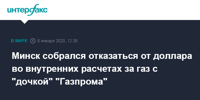 Москва. 6 января. INTERFAX.RU - Правительство и Нацбанк Белоруссии инициируют внесение изменений в межправительственное соглашение с РФ с целью отказа от использования доллара США во внутренних расчетах за газ между резидентами.