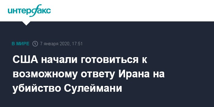 Москва. 7 января. INTERFAX.RU - В Вашингтоне готовятся к возможному ответу Тегерана на убийство генерала Касема Сулеймани, в частности, к попыткам покушения на жизни американских высокопоставленных военнослужащих, сообщает агентство Associated Press.