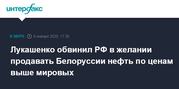 Между тем, близкий к пресс-службе Лукашенко телеграмм-канал "Пул Первого" процитировал главу государства: "В двух словах, почему с президентом России не договорились по нефти. Потому что РФ хочет, чтобы мы купили у нее нефть по ценам выше мировой. Где такое видано?! Поэтому я и отказался от такой нефти".