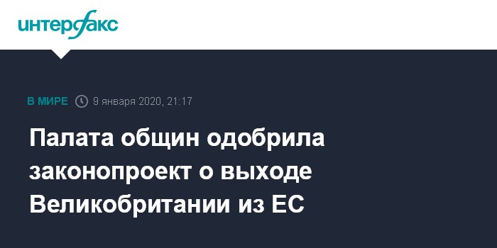 Москва. 9 января. INTERFAX.RU - Члены Палаты общин британского парламента одобрили законопроект о выходе Великобритании из Евросоюза, сообщил в четверг телеканал Sky News.