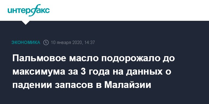 Москва. 10 января. INTERFAX.RU - Фьючерсы на пальмовое масло в пятницу подорожали до трехлетнего максимума на данных о более значительном, чем ожидалось, падении как запасов пальмового масла, так и объема его производства в Малайзии.