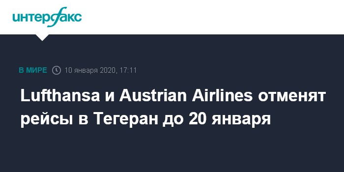 Москва. 10 января. INTERFAX.RU - Авиакомпании группы Lufthansa и Austrian Airlines до 20 января включительно не будут летать в Тегеран, сообщила пресс-служба концерна.