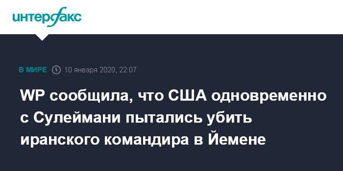 Москва. 10 января. INTERFAX.RU - Военные США в день убийства командующего иранского спецподразделения "Кудс" Касема Сулеймани попытались ликвидировать еще одного командира "Кудс" - в Йемене. Об этом сообщает газета The Washington Post со ссылкой на ряд неназванных официальных лиц США.