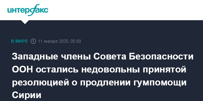 Москва. 11 января. INTERFAX.RU - Западные члены Совета Безопасности ООН остались недовольны компромиссной резолюцией о продлении на полгода трансграничной гумпомощи Сирии и обвинили Россию в политизации гуманитарной темы.