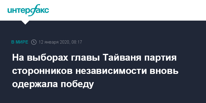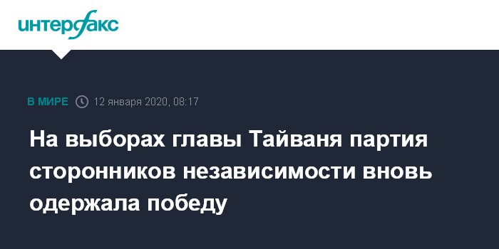 Москва. 12 января. INTERFAX.RU - Действующая глава администрации Тайваня Цай Инвэнь вновь одержала победу на состоявшихся в минувшую субботу выборах, сообщили местные СМИ.