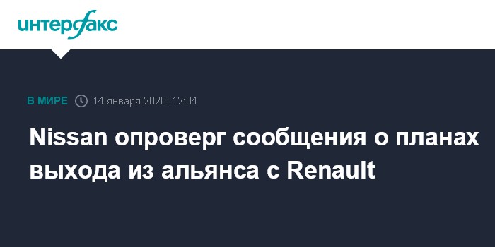 Москва. 14 января. INTERFAX.RU - Японская Nissan Motor Co. не рассматривает возможность выхода из альянса с Renault SA и Mitsubishi Motors Corp. вопреки сообщениям СМИ, говорится в пресс-релизе компании.