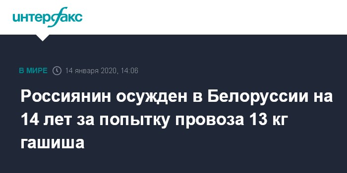 Москва. 14 января. INTERFAX.RU - Гражданин России осужден судом в Гродненской области Белоруссии на 14 лет лишения свободы в колонии усиленного режима за попытку провоза через госграницу республики 13 кг гашиша, сообщили в Госпогранкомитете (ГПК).