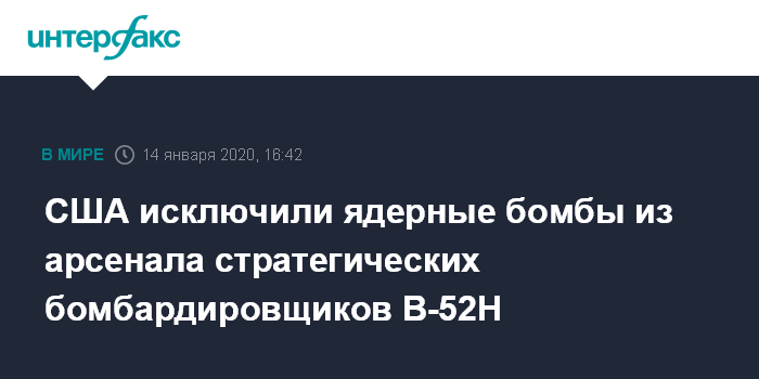 Москва. 14 января. INTERFAX.RU - Американские стратегические бомбардировщики B-52H Stratofortress более не подлежат оснащению ядерными авиабомбами, говорится в новой инструкции ВВС США.