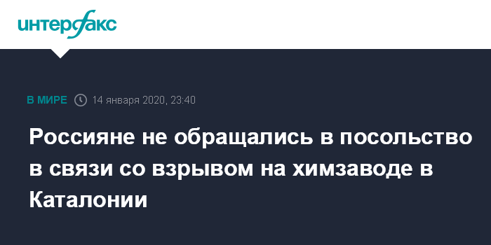 Москва. 14 января. INTERFAX.RU - Граждане России не обращались в посольство РФ в Мадриде в связи со взрывом на нефтехимическом заводе в муниципалитете Таррагона в Каталонии, сообщает диппредставительство.