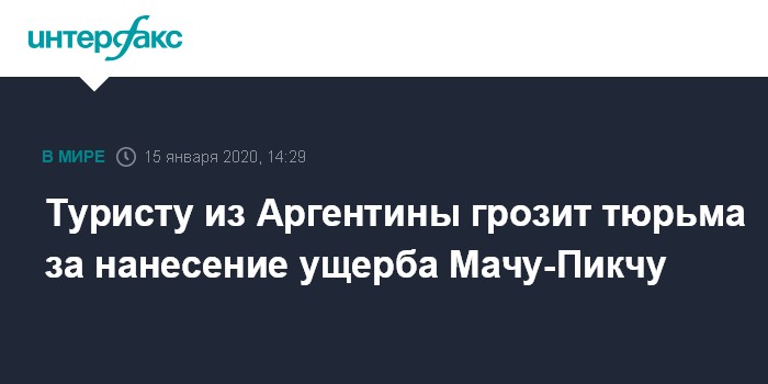 Москва. 15 января. INTERFAX.RU - Аргентинского туриста могут приговорить к тюремному сроку за нанесения непоправимого ущерба одному из строений древнего города Мачу-Пикчу в Перу, сообщает портал Diario Correo.