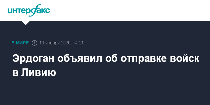 Москва. 16 января. INTERFAX.RU - Президент Турции Реджеп Тайип Эрдоган в четверг заявил, что Анкара начнет развертывание войск в Ливии, сообщают турецкие СМИ.