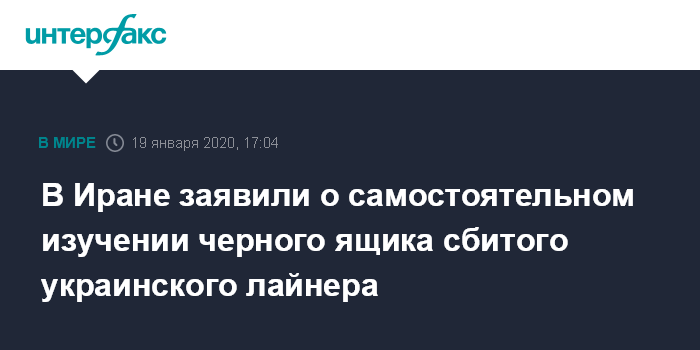 Москва. 19 января. INTERFAX.RU - Глава комиссии по расследованию авиационных происшествий организации гражданской авиации Ирана Хасан Резаифар заявил, что в настоящее время черный ящик сбитого под Тегераном самолета авиакомпании "Международные авиалинии Украины" изучают иранские эксперты.