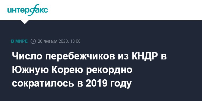 Москва. 20 января. INTERFAX.RU - Число граждан Северной Кореи, которые в 2019 году бежали из страны на юг, стало рекордно низким почти за 20 последних лет - с 2001 года, говорится в заявлении министерства Южной Кореи по делам объединения, которое цитирует сингапурский телеканал Channel NewsAsia.