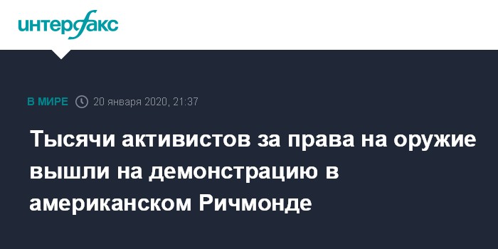 Москва. 20 января. INTERFAX.RU - Тысячи американцев, выступающих за сохранение в полном объеме прав на хранение и ношение оружия, в понедельник вышли на акцию в столице штата Вирджиния Ричмонд, сообщает The Wall Street Journal.