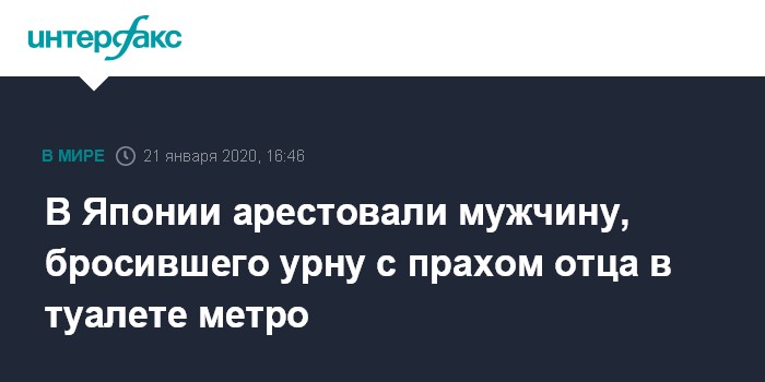 Москва. 21 января. INTERFAX.RU - Японская полиция арестовала мужчину, оставившего урну с прахом своего отца в туалете на одной из станций токийского метро, передает телеканал CNN во вторник.