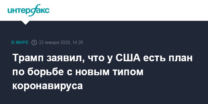 Москва. 22 января. INTERFAX.RU - Президент США Дональд Трамп в среду объявил, что его администрация разработала план по сдерживанию распространения нового типа коронавируса.