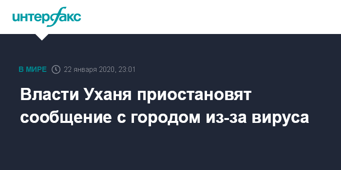Москва. 22 января. INTERFAX.RU - Транспортное сообщение с китайским городом Ухань приостанавливается с 10:00 местного времени (05:00 по Москве) в четверг из-за распространения остроинфекционного коронавируса, сообщило агентство Bloomberg со ссылкой на городские власти.