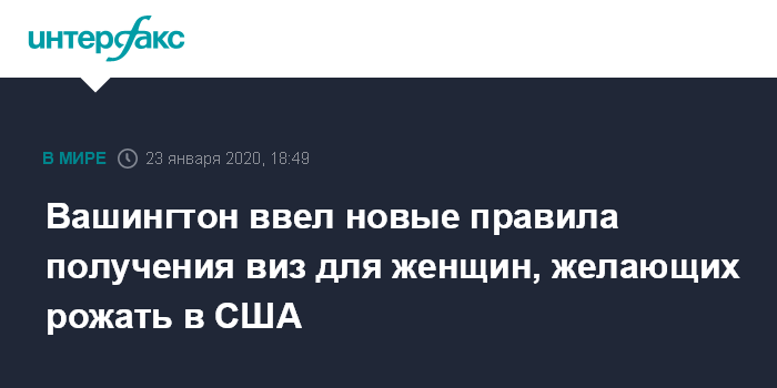 Москва. 23 января. INTERFAX.RU - Госдепартамент США в четверг распространил уведомление о том, что с 24 января будет прекращена выдача виз для временного пребывания иностранкам, рассчитывающим на въезд в США с целью "родильного туризма" - практики поездок в США для того, чтобы обеспечить автоматическое постоянное гражданство ребенку, рожденному на американской земле, говорится в сообщении Белого дома.