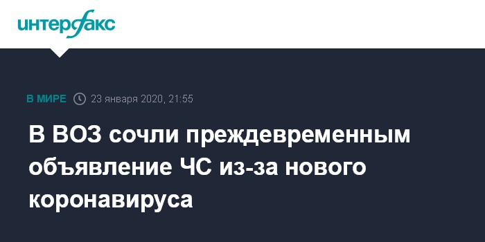 Москва. 23 января. INTERFAX.RU - Во Всемирной организации здравоохранения (ВОЗ) считают, что пока преждевременно объявлять чрезвычайную ситуацию в сфере международного здравоохранения из-за зафиксированного в КНР нового типа коронавируса.