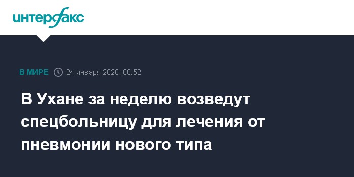 Москва. 24 января. INTERFAX.RU - Скоростное строительство больницы на 1 тыс. койко-мест, предназначенной специально для лечения больных пневмонией, вызываемой новым типом коронавируса, начато в китайском городе Ухань (провинция Хубэй), сообщают СМИ.