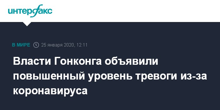 Москва. 25 января. INTERFAX.RU - Власти Гонконга в субботу приняли решение о введении повышенного уровня тревоги в связи с распространением "уханьского" коронавируса, сообщает South China Morning Post.