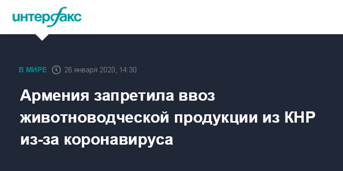 Москва. 26 января. INTERFAX.RU - Армения запретила импорт животноводческой продукции из Китая в связи с коронавирусом, сообщает Государственная служба безопасности пищевых продуктов.