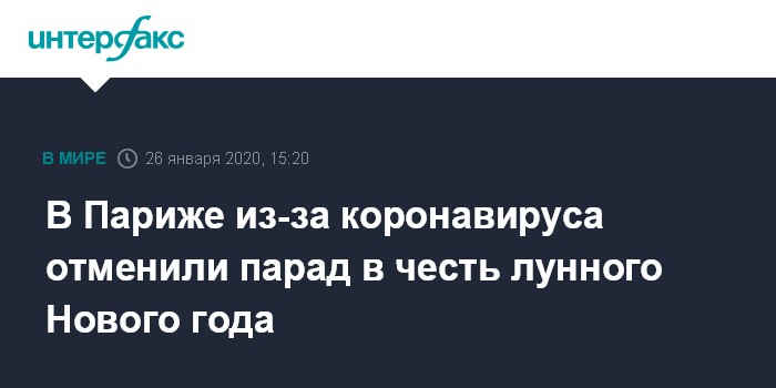 Москва. 26 января. INTERFAX.RU - Китайские организации отказались от проведения в центре Парижа в воскресенье парада в честь Нового года по лунному календарю в связи с ситуацией с новым коронавирусом, сообщает сайт издания The Guardian.