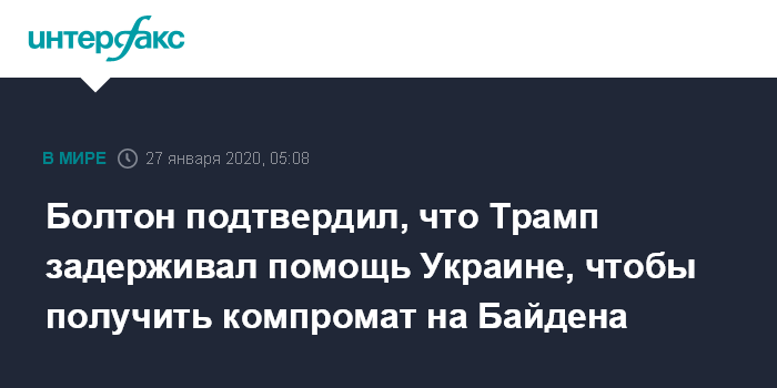 Москва. 27 января. INTERFAX.RU - Джон Болтон - отставной советник президента США по национальной безопасности - в своей готовящейся к выпуску книге признал, что президент США Дональд Трамп пытался путем задержки финансовой помощи Украине добиться проведения украинскими властями расследования деятельности отца и сына Байденов, сообщило издание New York Times.