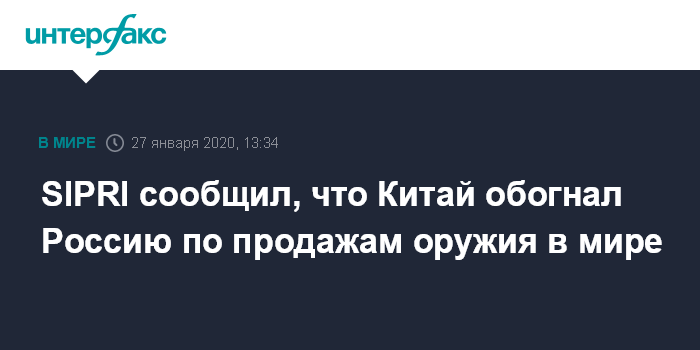 Москва. 27 января. INTERFAX.RU - Китай является вторым продавцом оружия в мире, опережая Россию и уступая лишь США, полагают авторы доклада, представленного в понедельник Стокгольмским институтом исследования проблем мира (SIPRI).