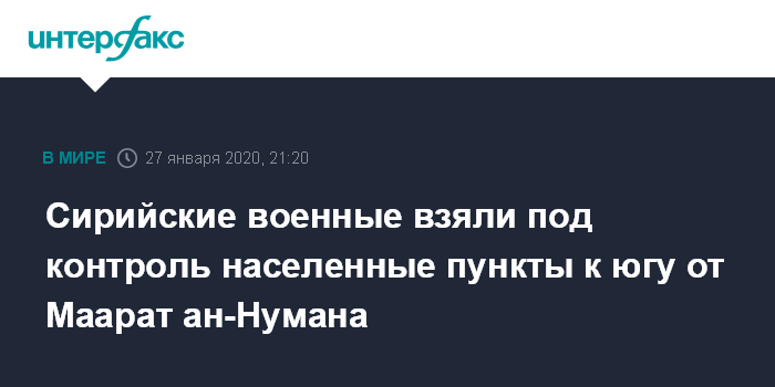 Москва. 27 января. INTERFAX.RU - Сирийские правительственные войска в понедельник взяли под контроль три населенных пункта, расположенных к югу от города Маарат ан-Нуман (провинция Идлиб), сообщает портал "Аль-Масдар".