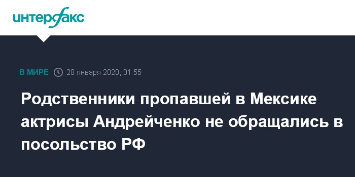 Москва. 28 января. INTERFAX.RU - Посольство РФ в Мексике занимается прояснением ситуации с пропажей актрисы Натальи Андрейченко, говорится в твиттере российской дипмиссии.