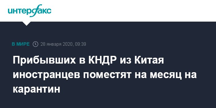 Москва. 28 января. INTERFAX.RU - Из-за распространения нового коронавируса всех иностранцев, которые приезжают в КНДР из Китая, будут изолировать на месяц и помещать под медицинское наблюдение, сообщило посольство России в Пхеньяне со ссылкой на ноту северокорейского МИД.