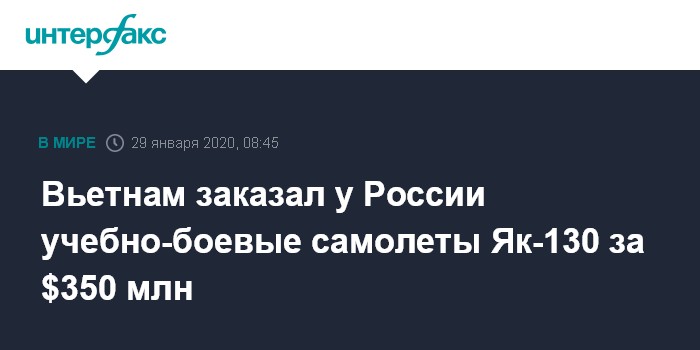 Москва. 29 января. INTERFAX.RU - Вьетнам и Россия заключили контракт на поставку учебно-боевых самолетов Як-130 стоимостью свыше $350 млн. Об этом сообщила газета "Ведомости" со ссылкой на источники.