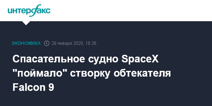 Москва. 29 января. INTERFAX.RU - Спасательное судно Ms. Tree поймало в надводные сети одну из двух многоразовых створок головного обтекателя ракеты Falcon 9, запущенной на орбиту, сообщила компания-разработчик SpaceX. Вторая створка упала в Атлантический океан, но ее можно будет достать.