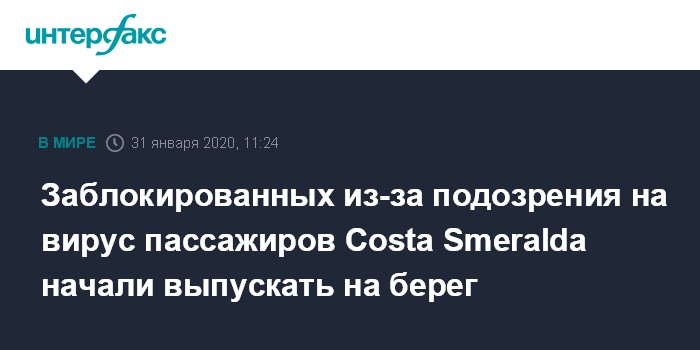 Москва. 31 января. INTERFAX.RU - Пассажиры с круизного лайнера Costa Smeralda, которым не разрешали сойти на берег в итальянском порту Чивитавеккья из-за подозрений на заражение двух человек "уханьским" вирусом, начали покидать судно, сообщает итальянская La Repubblica.