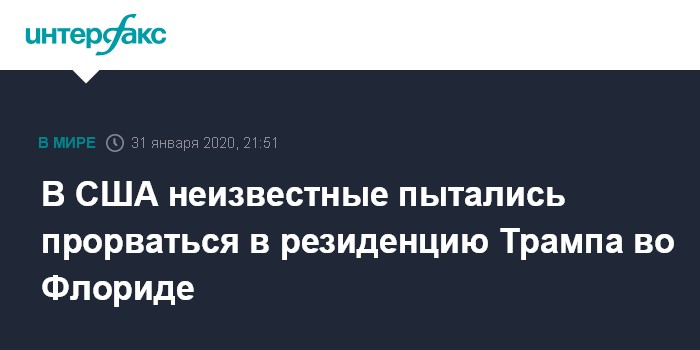 Москва. 31 января. INTERFAX.RU - Неизвестные на автомобиле попытались проникнуть на территорию резиденции президента США Дональда Трампа в Мар-а-Лаго во Флориде, сообщает CNN.