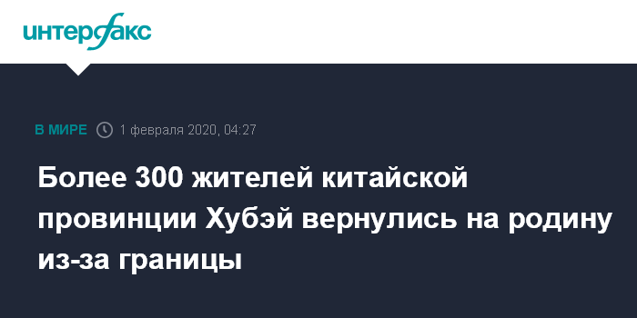 Москва. 1 февраля. INTERFAX.RU - В минувшую субботу 310 жителей провинции Хубэй, являющейся эпицентром распространения коронавируса нового типа, были чартерными рейсами китайских авиакомпаний доставлены на родину из-за рубежа, сообщили местные СМИ.