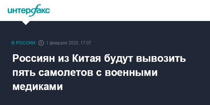 Ранее в субботу пресс-секретарь главы государства Дмитрий Песков сообщил, что самолеты ВКС задействуют для эвакуации российских граждан из районов Китая, наиболее пораженных коронавирусом.