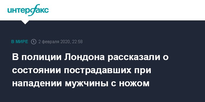 Москва. 2 февраля. INTERFAX.RU - В результате нападения неизвестного с ножом в Лондоне пострадали две женщины и один мужчина, он в больнице в опасном для жизни состоянии, говорится в заявлении представителя лондонской полиции Люси д'Орси.