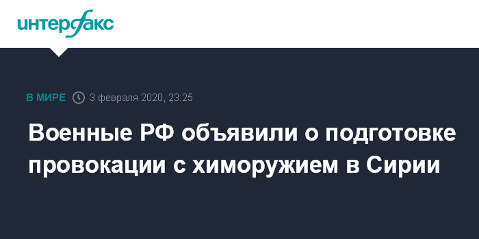 Москва. 3 февраля. INTERFAX.RU - Боевики в Идлибской зоне деэсакалации готовят провокацию с использованием отравляющих веществ, Турция может помочь в ее предотвращении, заявили в понедельник российские военные.