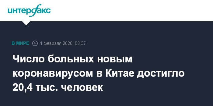 Число больных новым коронавирусом в Китае достигло 20,4 тыс. человек