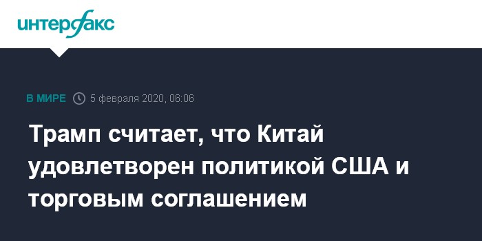 Москва. 5 февраля. INTERFAX.RU - В Пекине с уважением относятся к политике США в отношении Китая, и довольны результатами заключенной торговой сделки, заявил в среду президент США Дональд Трамп.