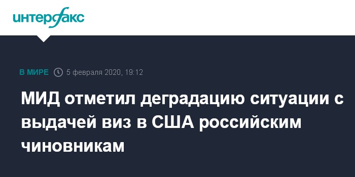 Москва. 5 февраля. INTERFAX.RU - Несмотря на обращения и призывы Москвы, отказы в визах в США становятся массовыми, в том числе продолжает деградировать ситуация с отказами в визах российским официальным лицам, которые собираются в служебные поездки, заявил российский МИД.
