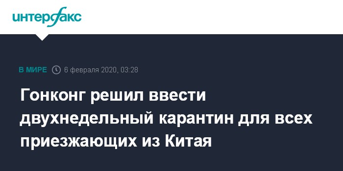 Москва. 6 февраля. INTERFAX.RU - В связи с распространением коронавируса власти Гонконга приняли решение о введении с субботы, 8 февраля, режима 14-дневного карантина для всех, кто будет прибывать в город из материкового Китая, сообщила газета South China Morning Post.