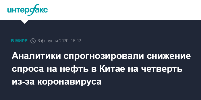 В январе спрос на нефть в Китае упал примерно на 3 млн баррелей в сутки, или на 20% объема потребления, сообщал ранее Bloomberg. Сокращение спроса в январе отмечалось вопреки традиционному всплеску в связи с ростом потребления топлива для перевозок граждан, которые ездят отмечать Новый год. Опасения о снижении спроса на энергоносители в Китае вызвали обвал котировок нефти.