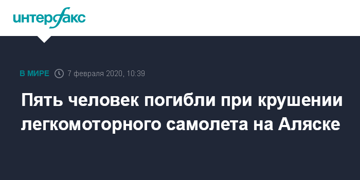 Москва. 7 февраля. INTERFAX.RU - Не менее пяти человек погибли в результате крушение легкого одномоторного самолета на юго-западе Аляски, сообщает телеканал CNN.