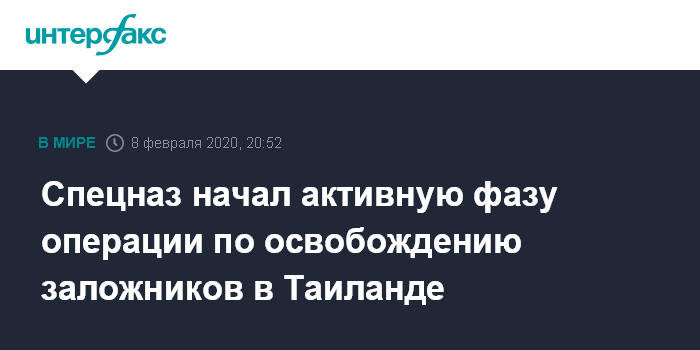 Москва. 8 февраля. INTERFAX.RU - Спецназ армии Таиланда приступил к активной фазе операции в торговом центре города Накхон Ратчасима (Корат), где вооруженный солдат продолжает удерживать 16 заложников, сообщают местные СМИ.
