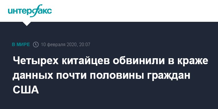 Москва. 10 февраля. INTERFAX.RU - Генпрокурор США Уильям Барр выдвинул против четырех граждан Китая обвинения во взломе компьютерных систем американского бюро кредитной истории Equifax, краже его коммерческой тайны и личных данных американцев, сообщает в понедельник Минюст Соединенных Штатов.