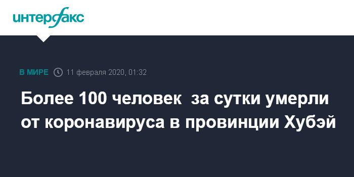 Москва. 11 февраля. INTERFAX.RU - В эпицентре распространения нового типа коронавируса китайской провинции Хубэй за истекшие сутки зарегистрировано 103 случая летального исхода от пневмонии, вызываемой новым типом коронавируса, и 2,097 тыс. новых случаев заражения, сообщили местные медицинские власти.